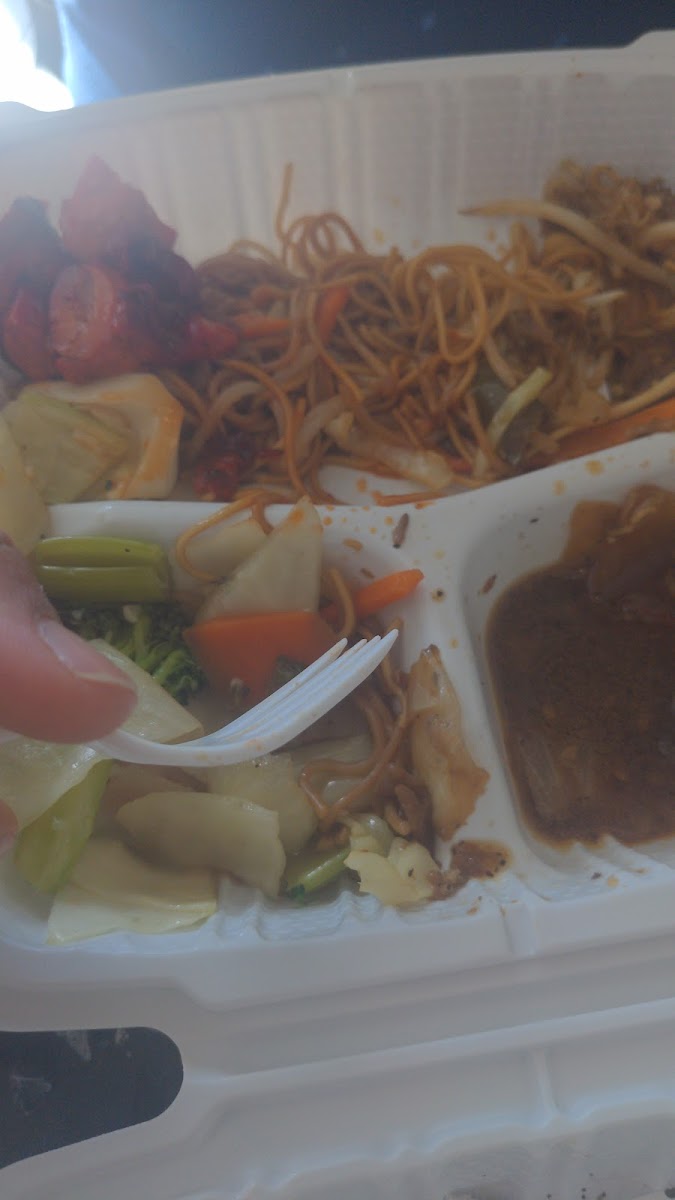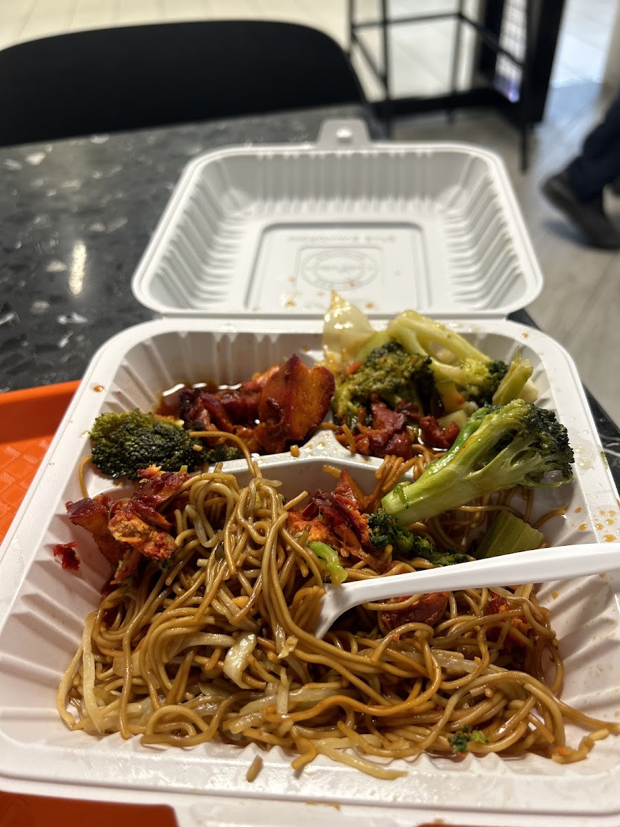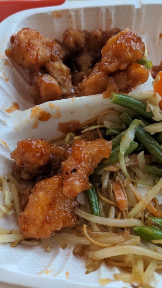 The sweet chili chicken and the sweet and sour pork at this location is very good. The issue with the food is the noodles are very bland, mushy and kind of cold. There was a few burnt noodles in my meal. As for service, I was greeted right away by the worker who was friendly. One problem is the worker I dealt with kept trying to upsell my order. Pricing is a little expensive for what you get.